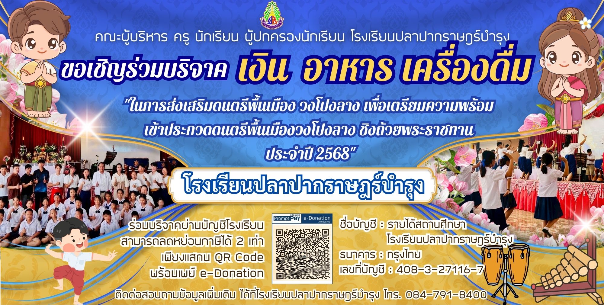 - วันจันทร์ที่ 14 เมษายน 2568 ร่วมสืบสานอนุรักษ์วัฒนธรรมไทย “ประเพณีสงกรานต์ร่วมใจไทปลาปาก” ประจำปี 2568 โรงเรียนปลาปากราษฎร์บำรุง ได้ดำเนินการจัดทำขบวนแห่ชุดชุดเฉลิมพระเกียรติฯ และนำการแสดง ของนักเรียนวงโปงลางโรงเรียนปลาปากราษฎร์บำรุง ร่วมแสดง เพื่อสืบสานว ( 17 พ.ค. 68 )